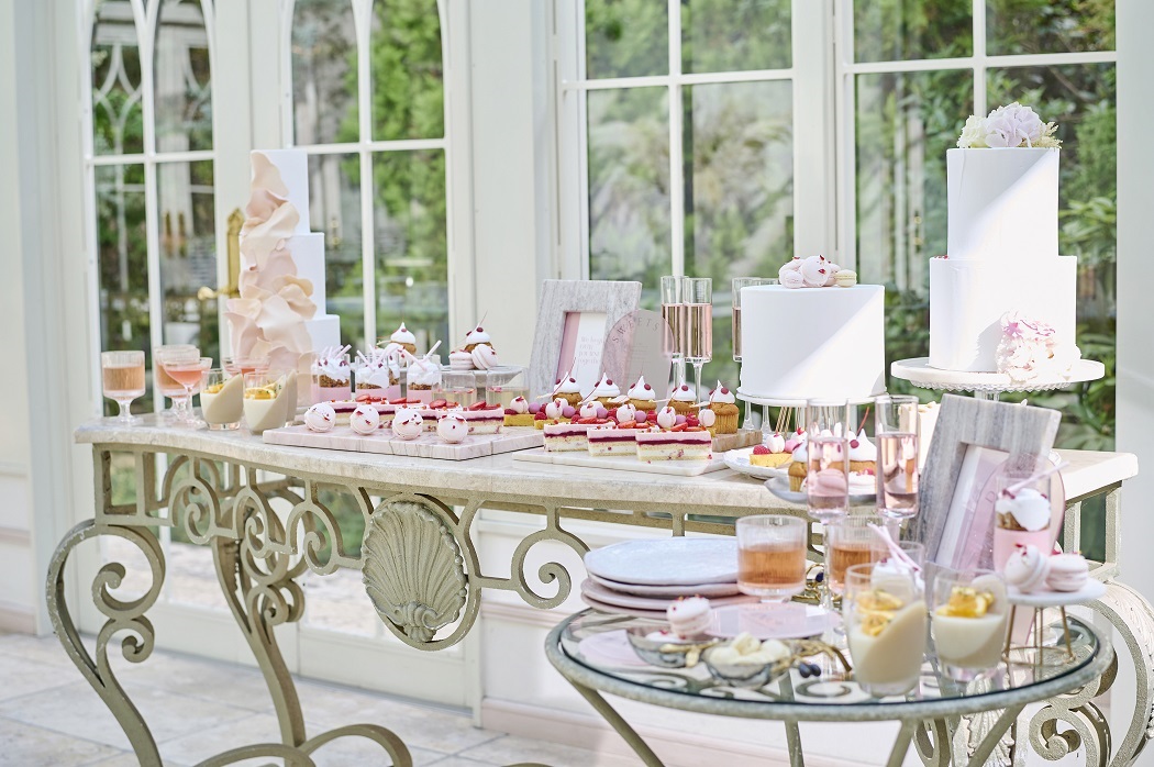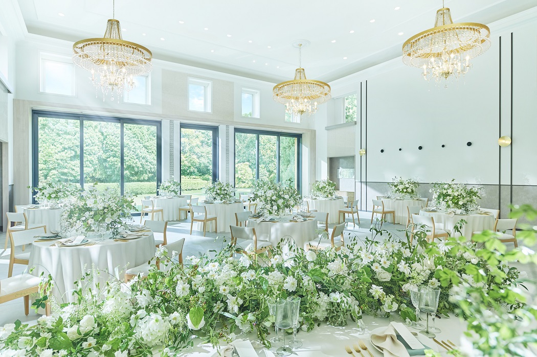 大きな窓からやわらかな光が差し込み、天候を気にせず憧れの演出が叶うガラス張りのコンサバトリーや、シャンデリアが煌めく会場の外には、プライベートガーデンが広がり、デザートビュッフェなども行えます。